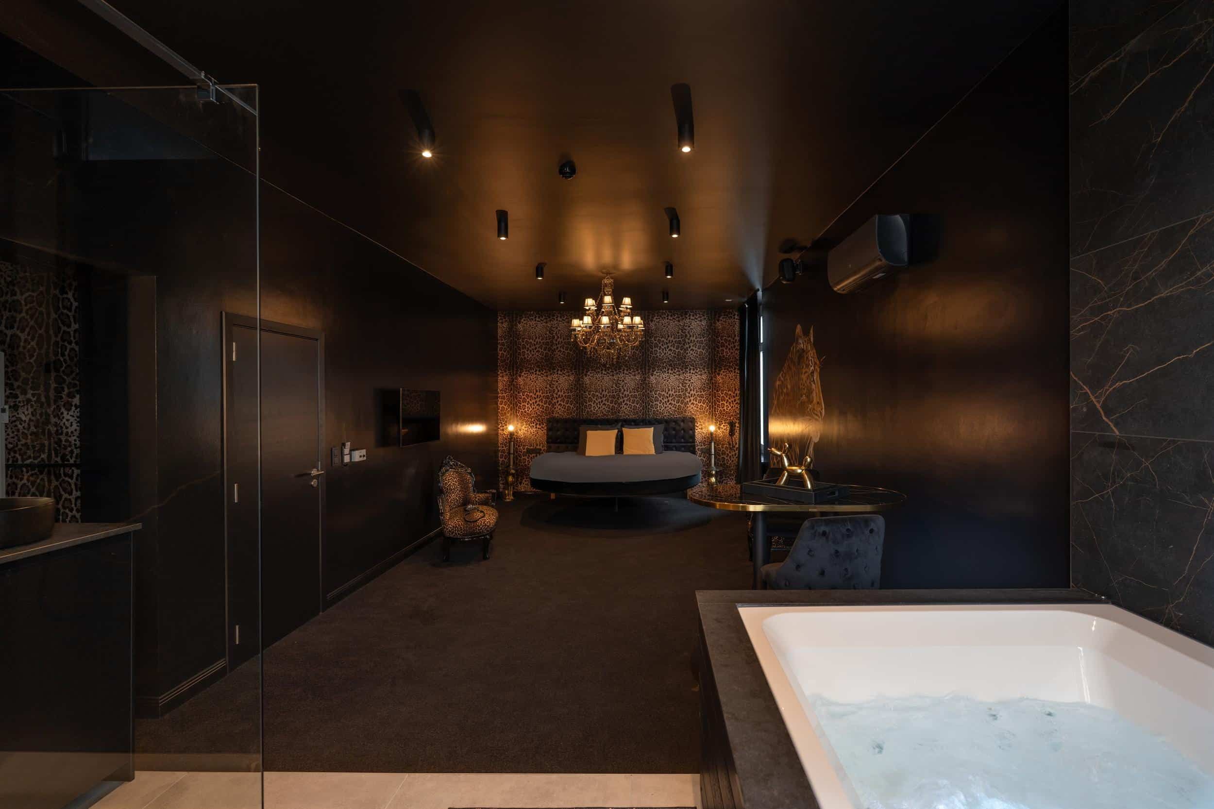 Un lit rond XXL suspendu, une baignoire balnéo généreuse, et une déco flamboyante. Balcon, coin repas, sono, clim et une signature inimitable.