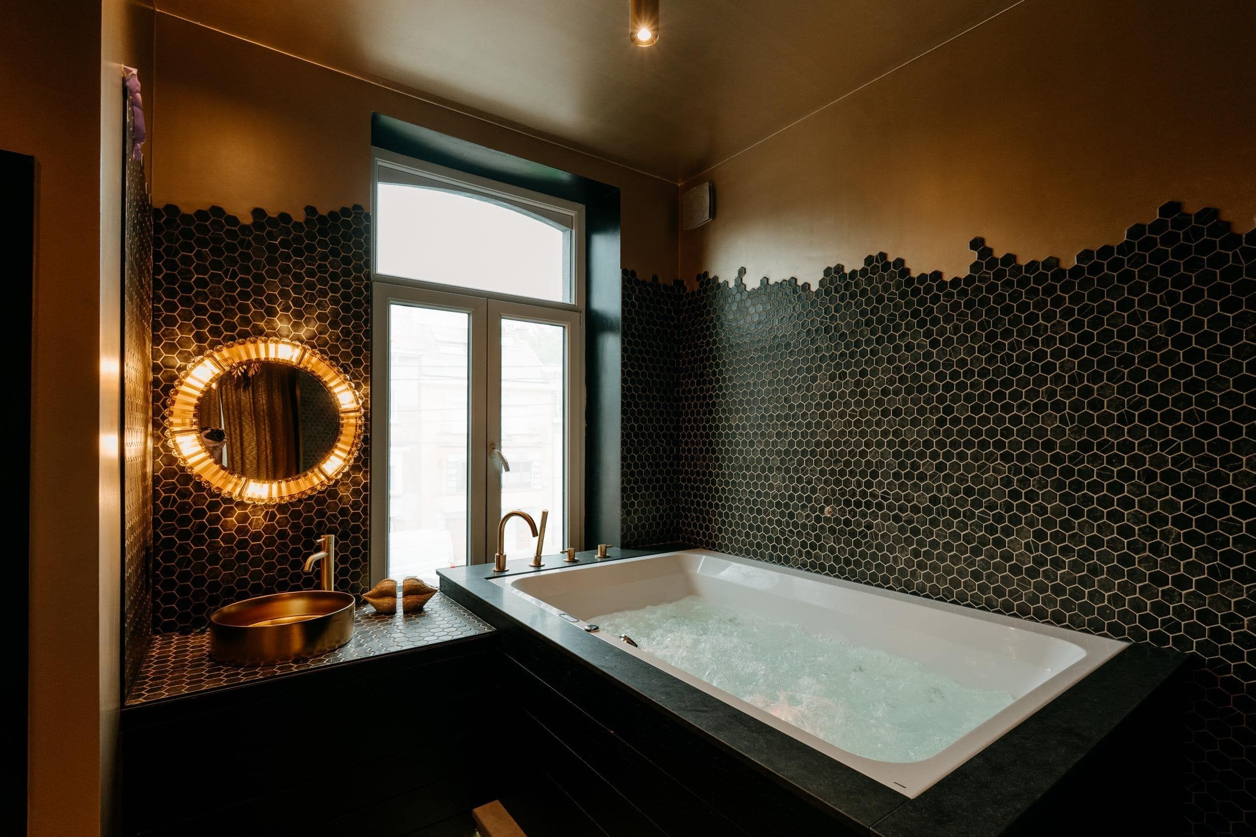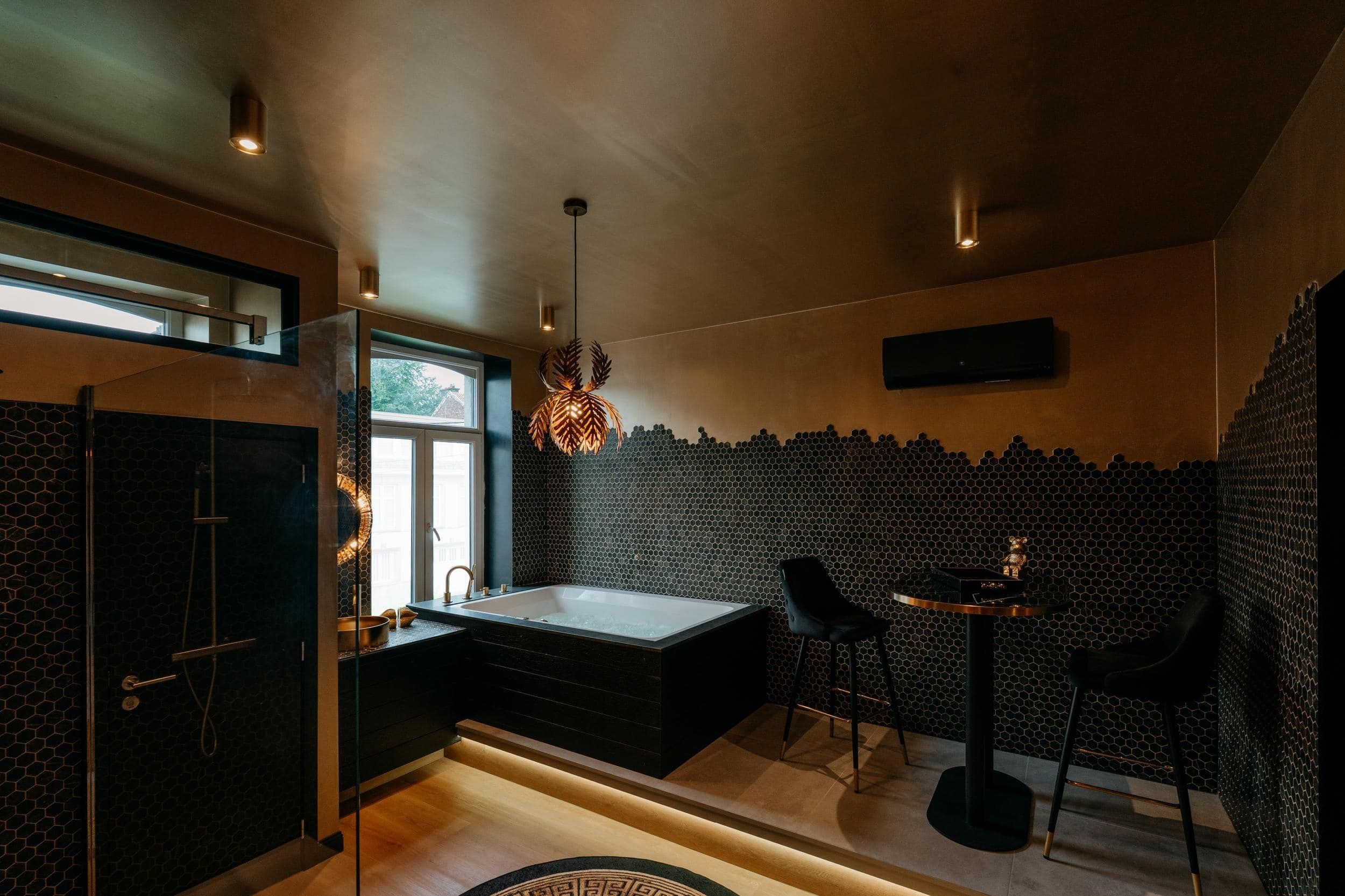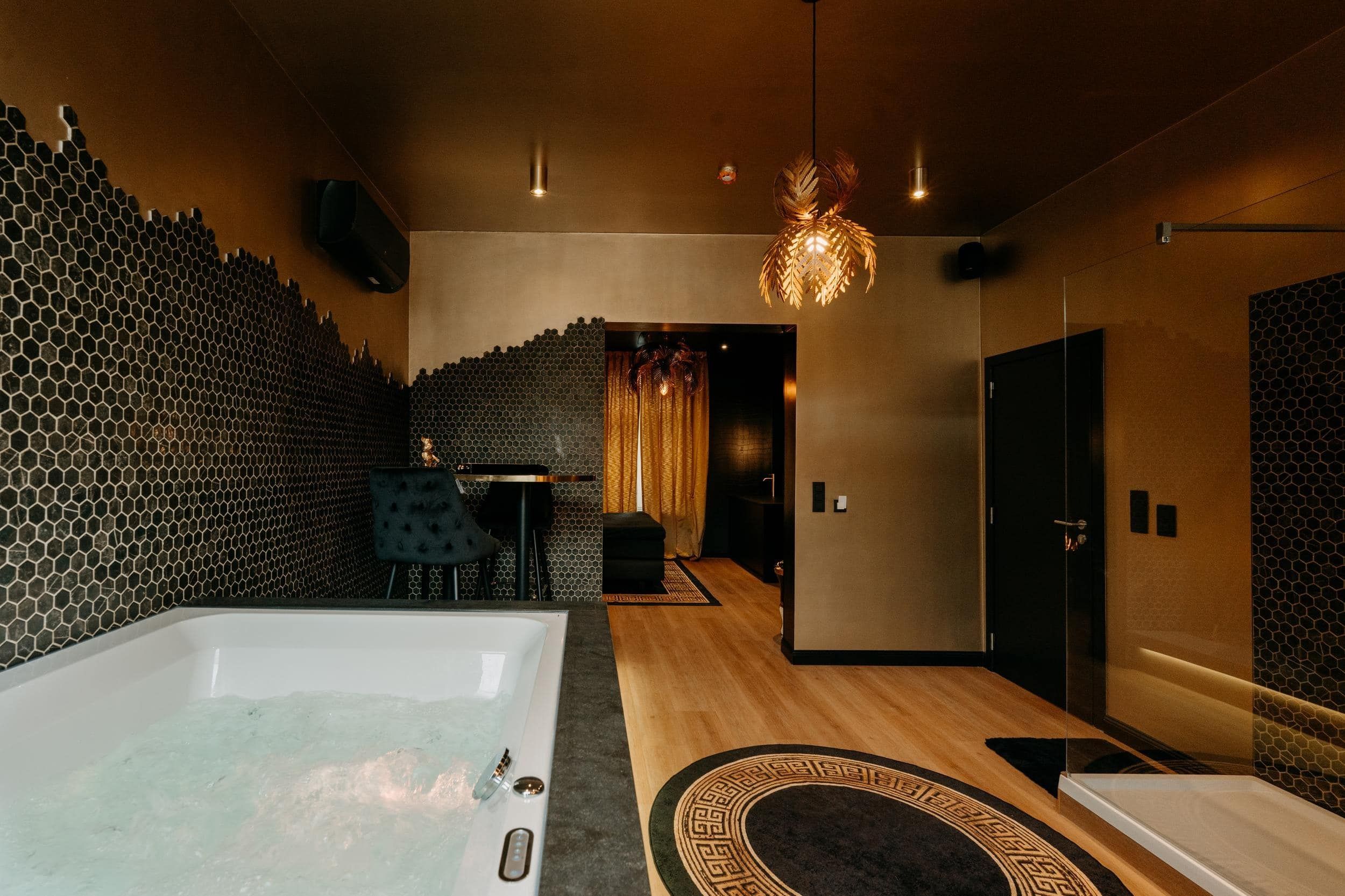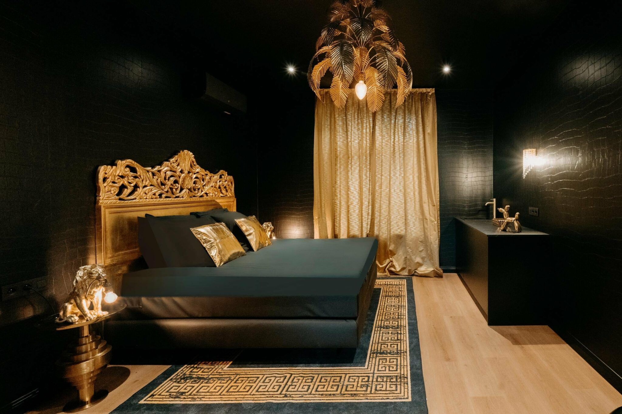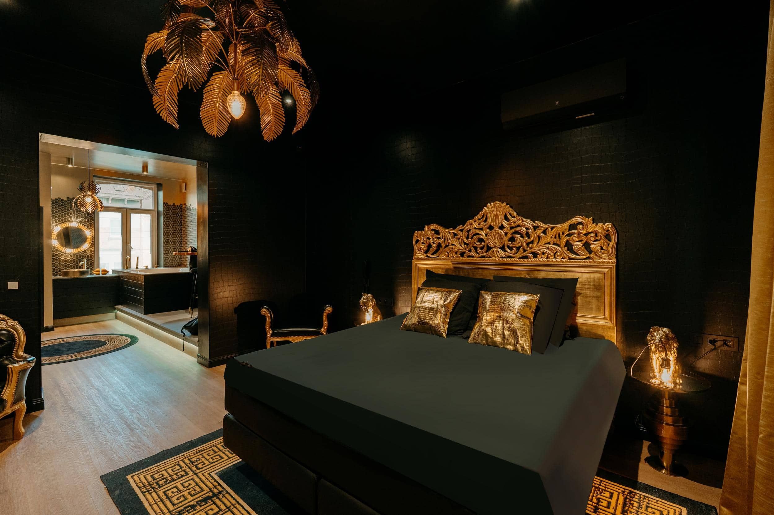 Un univers rococo assumé, mêlant dorures et volupté. Lit royal king size, baignoire balnéothérapie XL, douche à l’italienne , cuisiné équipée, et sono pour l’ambiance.